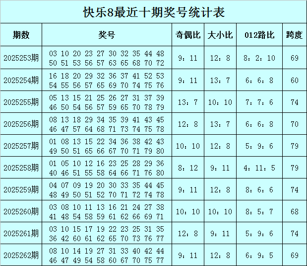 福彩快乐8第2025262期开奖回顾:08 10 14 19 27 31 33 40 42 44 46 47 49 54 58 60 67 70 75 77,其中奖号奇偶比开出9:11,大小比开出12:8,012路比开出6:9:5,和值为871,跨度为69。